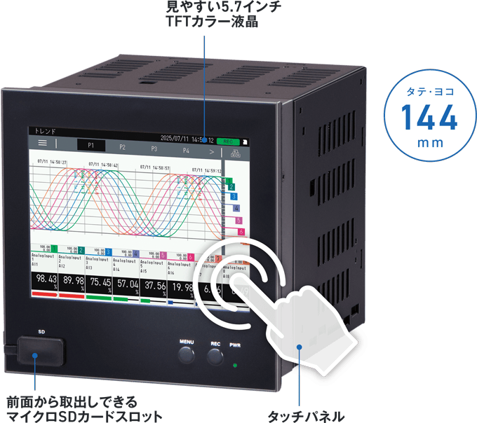装置や設備の測定データや運転・停止の状態を内部メモリに記録、SDカードにも保存できます。